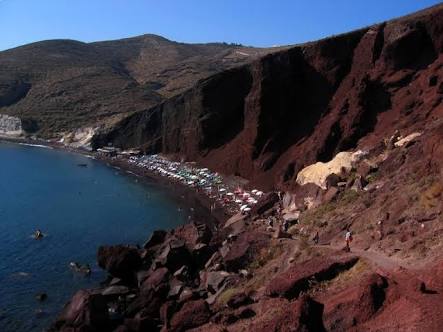 Santorininin merkezi Fira, bütün otobuslerin hareket yeri fira terminali, bu nedenle eğer araç kiralamayacaksaniz fira ‘ da kalmak mantıklı. Otobüsle bir yerlere gitmek kişibaşı 2-3 €. Bizim Santorini’de 1 tam günümüz var. Sabah ilk olarak farklı bir plaj görmek adına red beach ‘e gidiyoruz. Otobüsle gidiş 1 saati geçiyor. Akrotiriden sonra hemen sonra otobüsten inip plaja yürümek gerekiyor. Balikcilarin onunden kisa bir yuruyus ve Hafif tırmanıştan sonra bir patikaya giriliyor. Bu patikaya girmeden önce meyve ve içecek satan arabalar var, burdan bişeyler almak lazım. Plajda küçük bir büfe dışında bi şey yok. Patikada ufak bir tırmanışin ardından kızıl kumlu plaj karşınıza çıkıyor. Biz gittiğimizde tam manzaranin karşınıza çıktığı yerde canlı müzik vardı. Çaldiklari şarkılar bizim turkcelerine aşina olduğumuz müzikler, kültürün bu derece ortak olmasi insanı sasirtiyor. Manzarayı tepeden gördükten sonra kayaların arasından sahile inen yoldan 5 dk kadar inmek gerekiyor. Sert kayaların üzerinde ince bir kumsal burası, ve oldukça dalgalı. Türkiye’nin plajlarından sonra burası yüzmek için çok cazip gelmiyor ama bakir ve farklı oluşu nedeniyle görmek keyifli oldu bizim için.